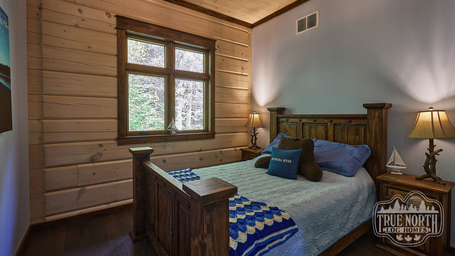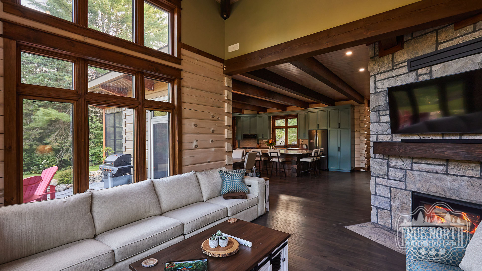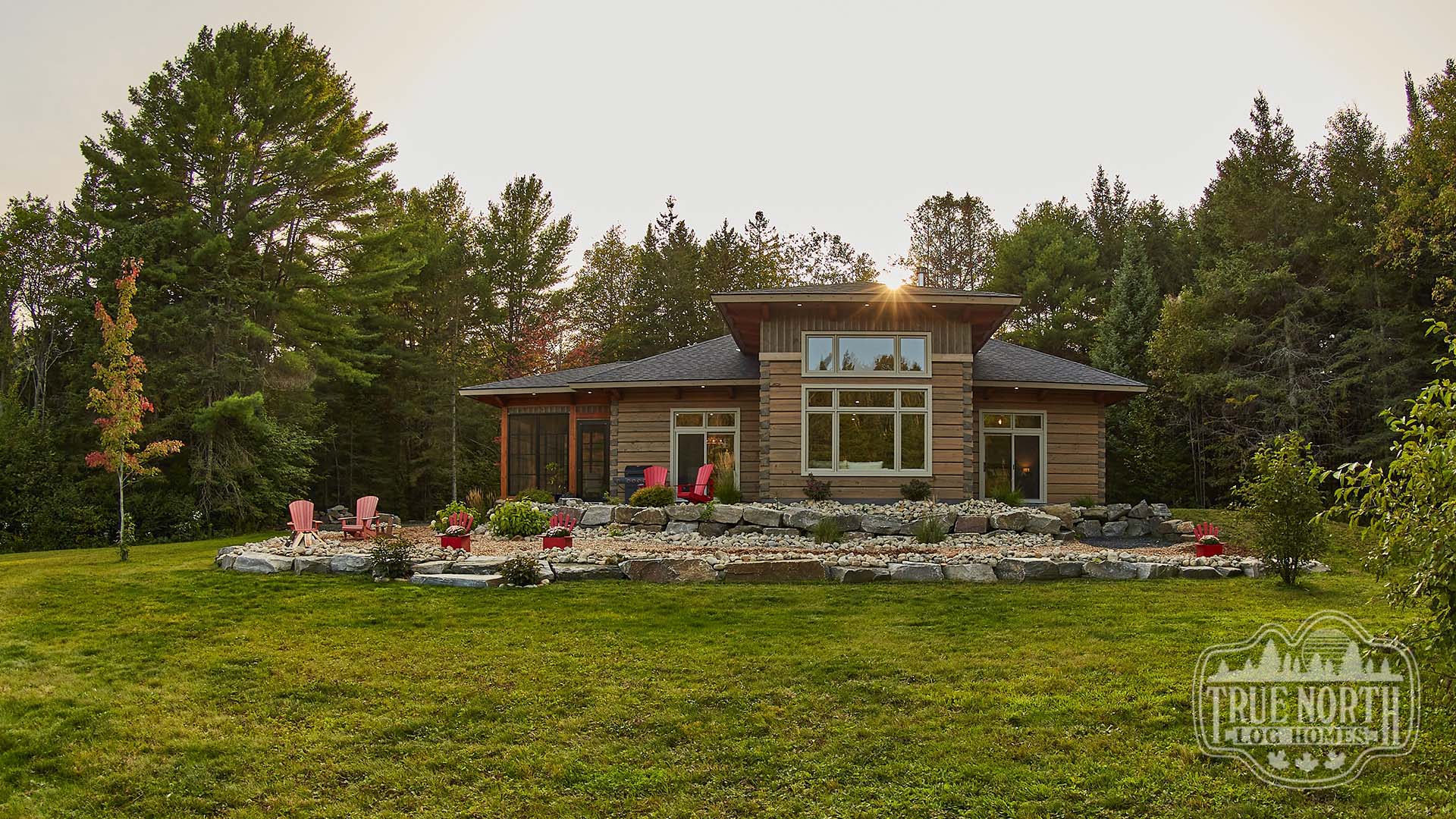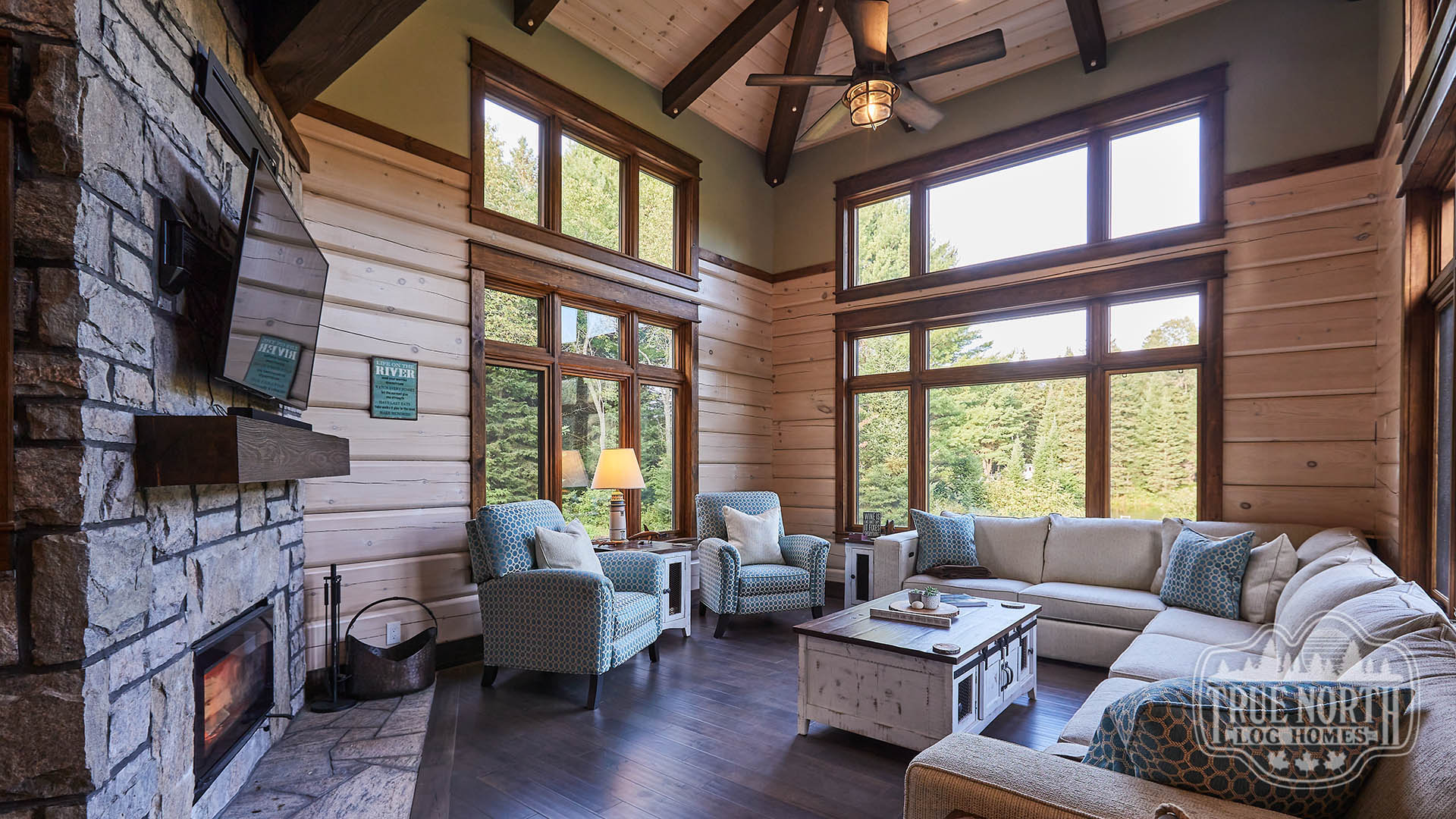 Building on the popularity of the Lakeview I and Lakeview II, we’re pleased to bring you another contemporary style design: the Riverview. Boasting 3 bedrooms, 2 baths, double car garage and screen porch, this modern log home design floods you with natural light in the double storey foyer upon entry. Straight ahead, the secondary bedrooms await. To the right, you’ll find a well-appointed kitchen and dining area which lead to the screened-in porch. The great room, with its 13’ ceilings and panoramic views, is the perfect spot to relax with friends and family. It’s easy to see why this efficient “L” shaped plan is quickly becoming a favorite.