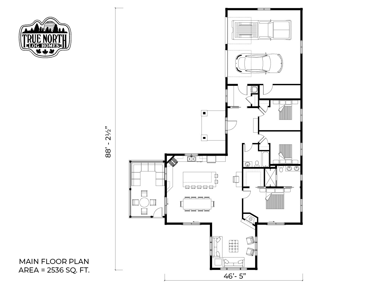 Building on the popularity of the Lakeview I and Lakeview II, we’re pleased to bring you another contemporary style design: the Riverview. Boasting 3 bedrooms, 2 baths, double car garage and screen porch, this modern log home design floods you with natural light in the double storey foyer upon entry. Straight ahead, the secondary bedrooms await. To the right, you’ll find a well-appointed kitchen and dining area which lead to the screened-in porch. The great room, with its 13’ ceilings and panoramic views, is the perfect spot to relax with friends and family. It’s easy to see why this efficient “L” shaped plan is quickly becoming a favorite.
