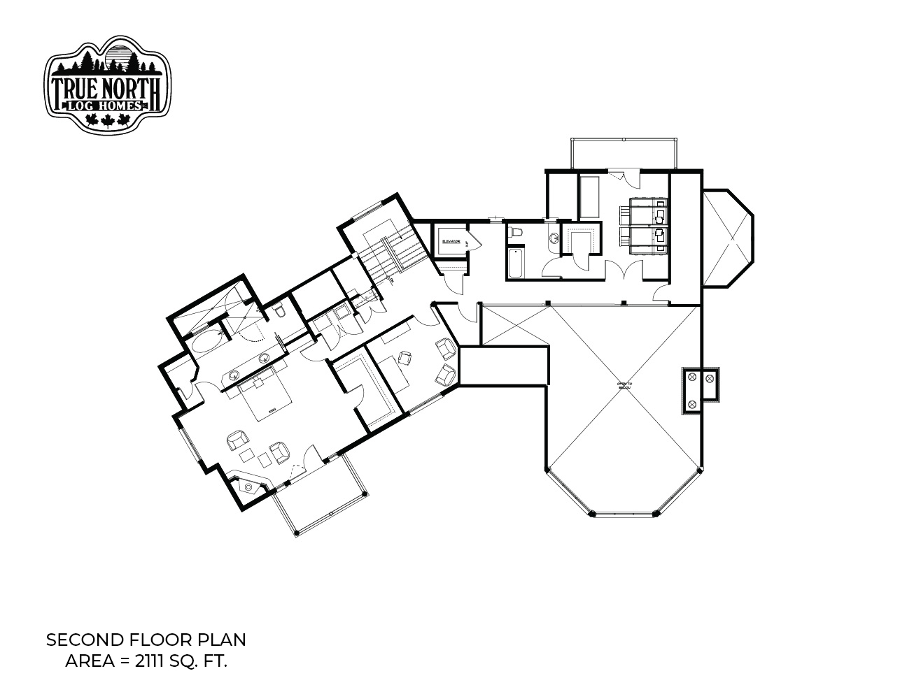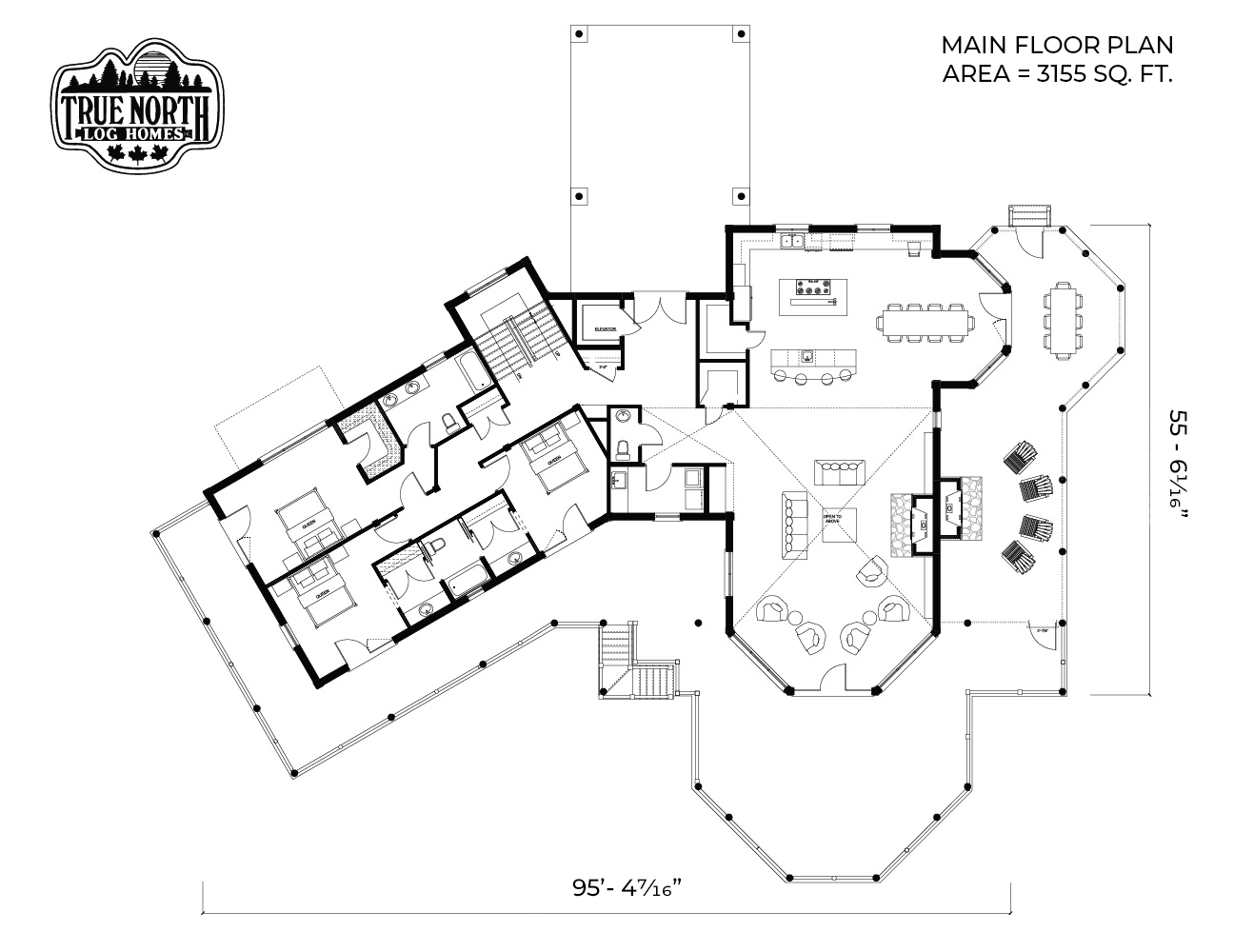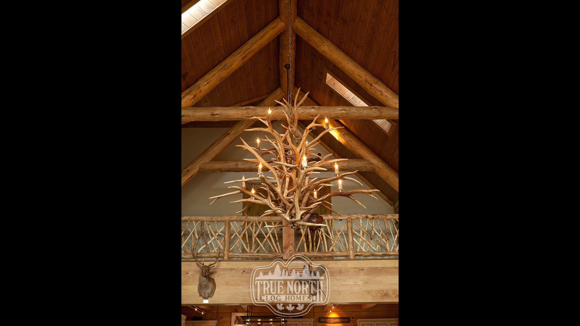 This beautiful log home is fully custom-built. The grand front entry of this True North log home features a large, vaulted log drive-thru portico. A unique staircase bridges the gap between the driveway and the porch and grants access to the large outdoor living area. The home is focused on low energy consumption and environmental soundness.